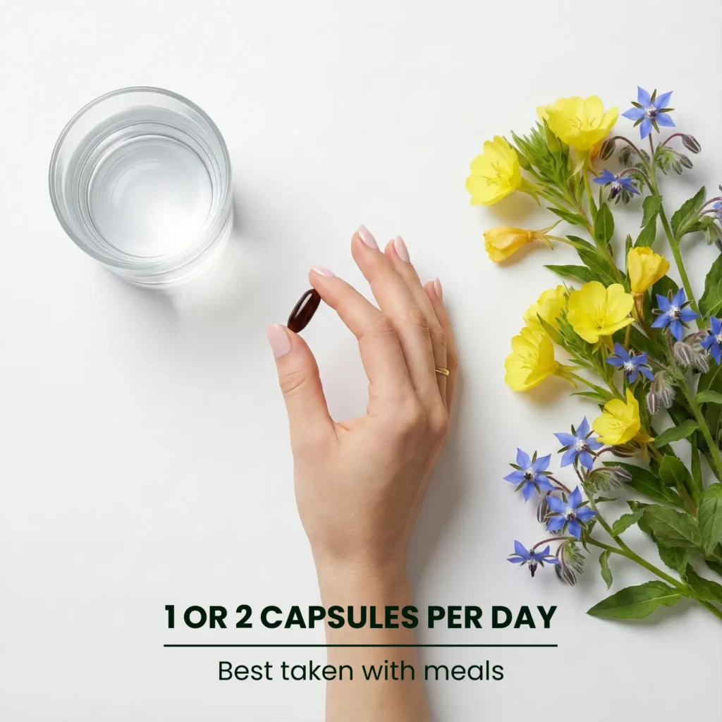 Each capsule delivers 120 mg of GLA (gamma-linolenic acid). This daily dose is sufficient for regular needs. For specific requirements or increased demands, the dose can be adjusted to two capsules per day, providing a total of 240 mg of GLA. A flexible and effective solution, designed to adapt to every stage and need.