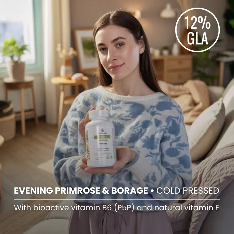 Premium cold-pressed evening primrose and borage oils, delivering a potent 12% GLA (gamma-linolenic acid) blend enhanced with bioactive vitamin B6 (P5P) and natural vitamin E. This synergistic formula maximizes GLA absorption and utilization for optimal wellness support.