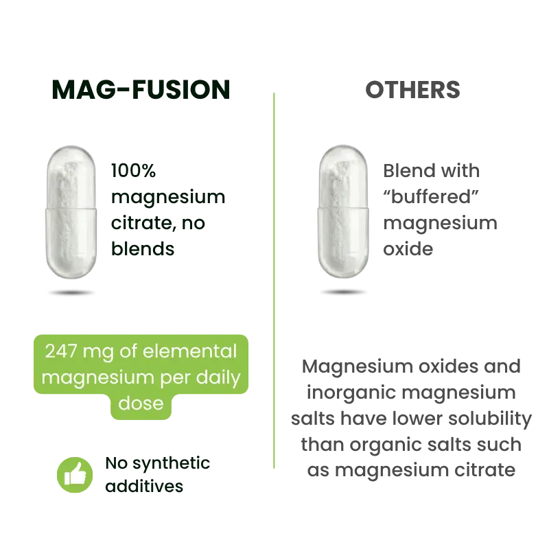 Mag-fusion provides 247 mg of elemental magnesium per daily dose, using magnesium citrate exclusively as its sole source. By avoiding blends with magnesium oxide, the so-called “buffered” forms, which are often used to increase total magnesium content, we ensure a more consistent and transparent formula.